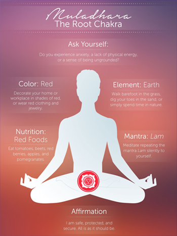Located at the base of the spine, the pelvic floor, and the first three vertebrae, the root chakra or Muladhara is responsible for your sense of safety and security on this earthly journey. Balancing the root chakra creates the solid foundation for opening the entire chakra system. Imagine that you’re laying the foundation for a house in which you’re going to live for a long time. A solid foundation embedded in firm soil will provide the stability you need to create a home filled with joy for years to come. The first chakra is comprised of whatever grounds you to stability in your life. This includes your basic needs such as food, water, shelter, and safety, as well as your more emotional needs such as letting go of fear. When these needs are met, you feel grounded and safe, and tend to worry less day to day.IMBALANCES IN THE ROOT CHAKRA