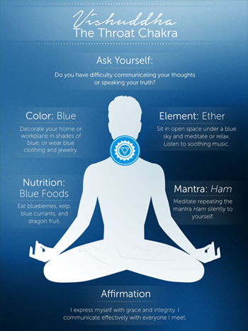 In the area of the throat, the fifth chakra, or Vishuddha, governs the anatomical regions of the thyroid, parathyroid, jaw, neck, mouth, tongue, and larynx. To be open and aligned in the fifth chakra is to speak, listen, and express yourself from a higher form of communication. Faith and understanding combine the essence of the Vishuddha chakra.