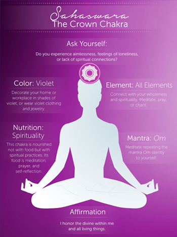 The seventh chakra, Sahaswara, is referred to as the thousand-petal lotus chakra. Of the seven main chakras, this one is highest on the body, located at the crown of the head. Sahaswara is our source of enlightenment and spiritual connection to our higher selves, to every being on the planet, and ultimately to the divine energy that creates everything in the universe.